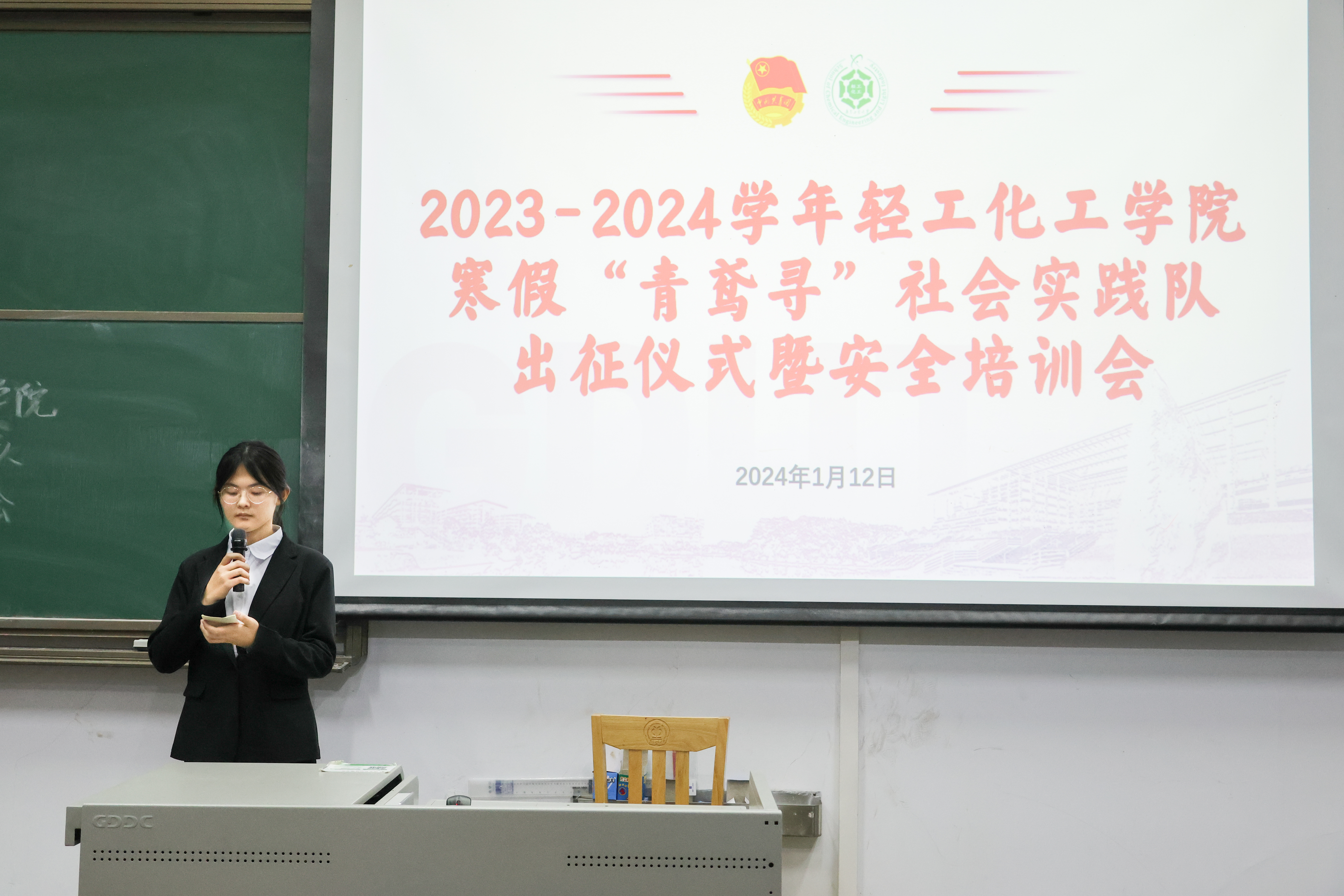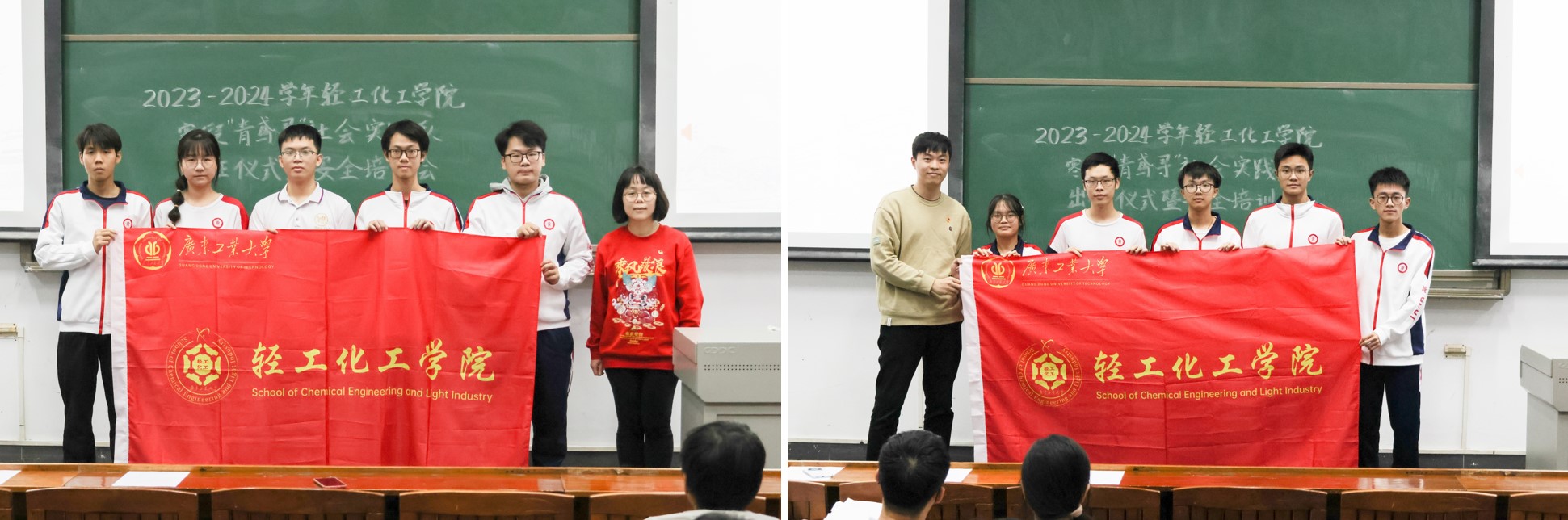 最后,李韵捷和张昊昀老师分别为参与社会实践的实践队伍代表授旗,鼓励他们投身社会实践时发扬团队合作精神和奉献精神,展现轻化学子的青春力量。