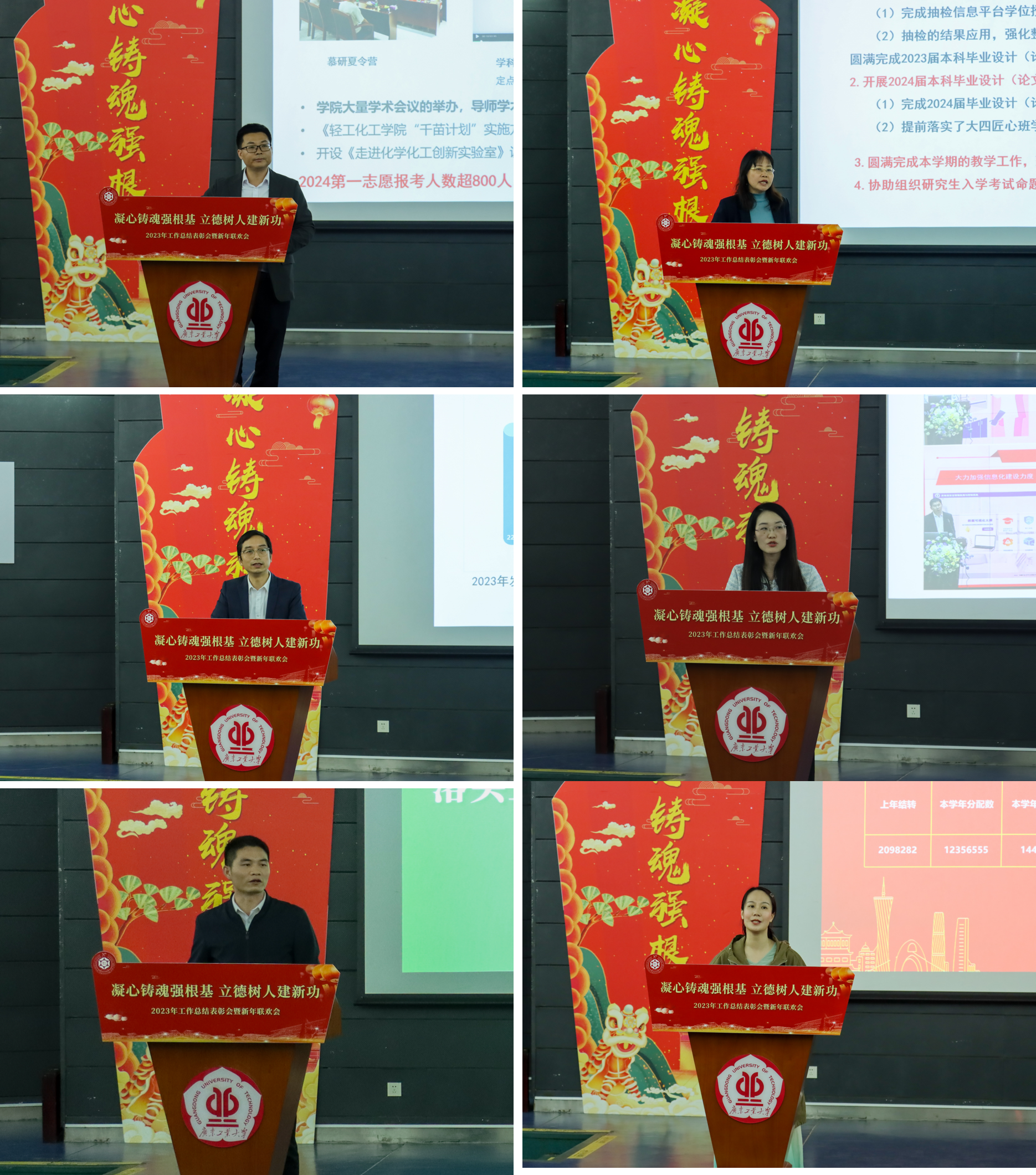 副院长何军、郑育英、李成超、钟远红,副书记杨刚分别就研究生培养、本科教学、科学研究、实验室管理、学生工作、工会工作等进行了工作总结和展望。党政办公室主任张金名作了学院年终财务报告。会议还对寒假期间留校师生人财物安全、实验室安全、网络安全等工作进行了部署。