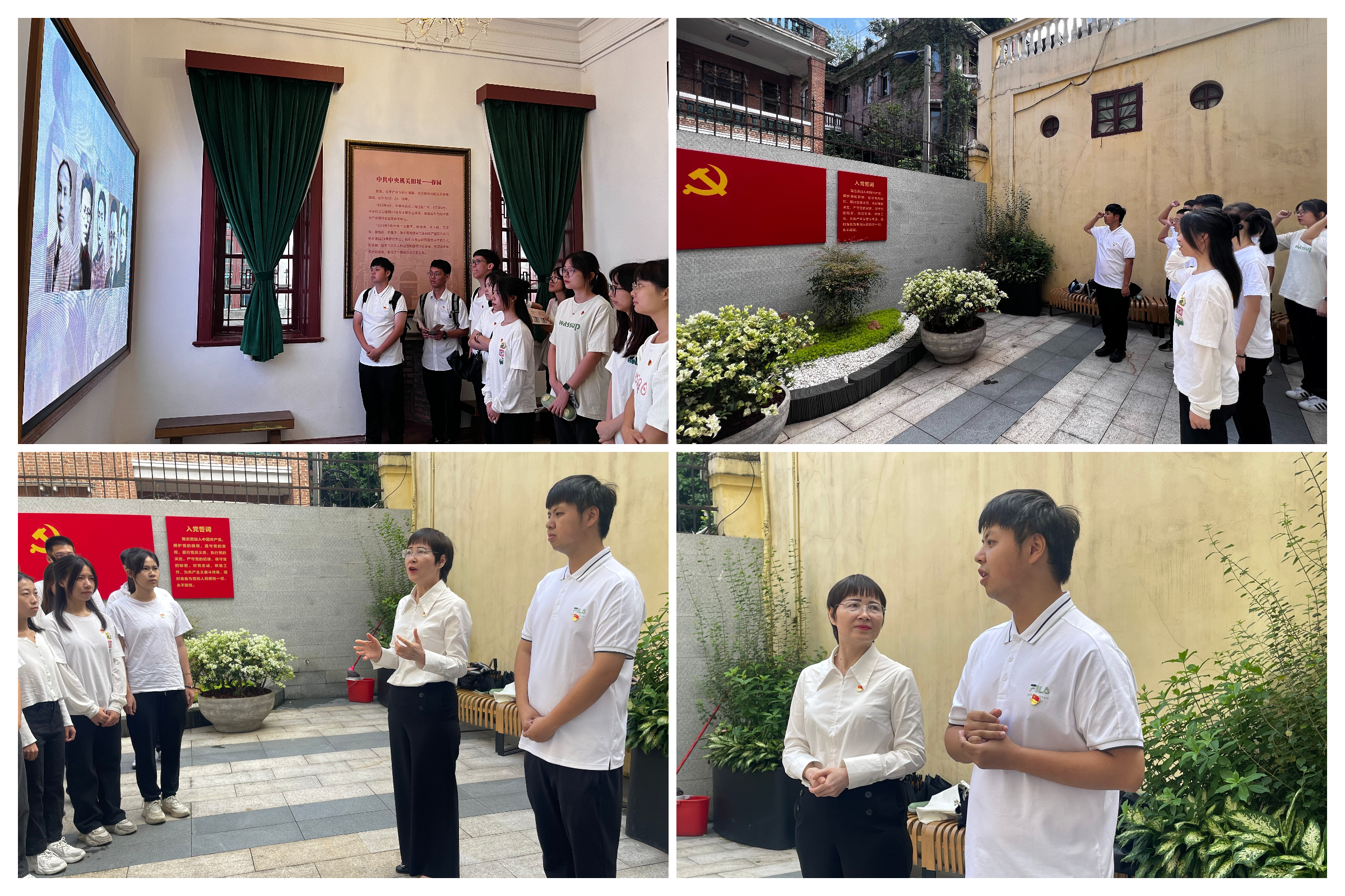 春园是中国共产党早期的重要活动场所之一,中共三大会议期间,陈独秀、李大钊、毛泽东、瞿秋白等人都曾住在“春园”24号二楼,并在这里讨论和修改了中国共产党党纲、党章,起草大会的宣言和各项决议草案。在冯浩宸老师、许维利老师的带领下,同志们参观了春园,并在党旗下重温了入党誓词。许维利老师从自己的亲身经历讲起,希望同志们能牢记历史、珍惜当下的美好生活,利用好支部结对共建的契机,发挥好学校“以工为主、工理经管文法艺结合”的优势,在科研活动、文艺活动上协同发展,主动投身中国式现代化的广东实践。冯浩宸老师从国庆期间热映的电影《志愿军:雄兵出击》谈起,结合自身求学过程,希望同志们能不负时代重托、不负青春韶华,敢于亮身份、做表率、树形象,彰显学生党员的责任与担当;还强调作为学生党员要有政治定力,用好线上线下多渠道资源将党的理论学深、学透,坚定走好中国道路和实现中华民族伟大复兴的信心和决心。
