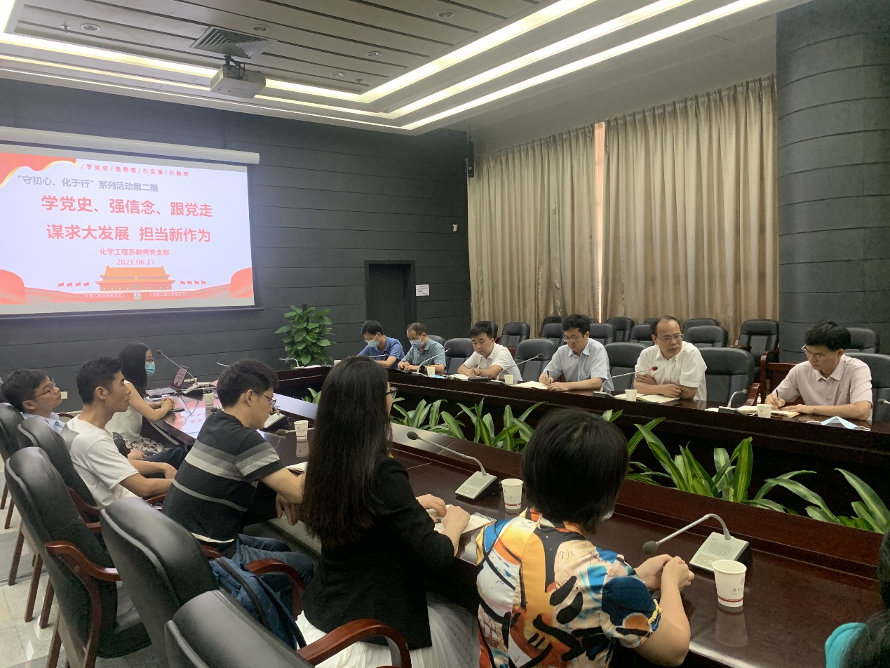 落其实者思其树,饮其流者怀其源,中国共产党走过了一百年风云激荡,一百年沧海桑田。初心依旧,砥砺前行。学习党的百年奋斗史,可从党的奋斗历程和伟大成就鼓舞斗志、明确方向;从英雄事迹激发源于内心深处的信仰和精神力量;用党的光荣传统和优良作风坚定信念、凝聚力量;用党的实践创造和历史经验启迪智慧、砥砺品格。6月17日上午,化工系教工党支部在学校会议室举办“学党史、强信念、跟党走”为主题的组织生活会,支部党员、学校校长邱学青同志讲授了“学党史、强信念、跟党走——谋求大发展,担当新作为”为主题的党课。化工系全体党员、院党委书记参加会议,会议由党支部书记、院长王铁军同志主持。