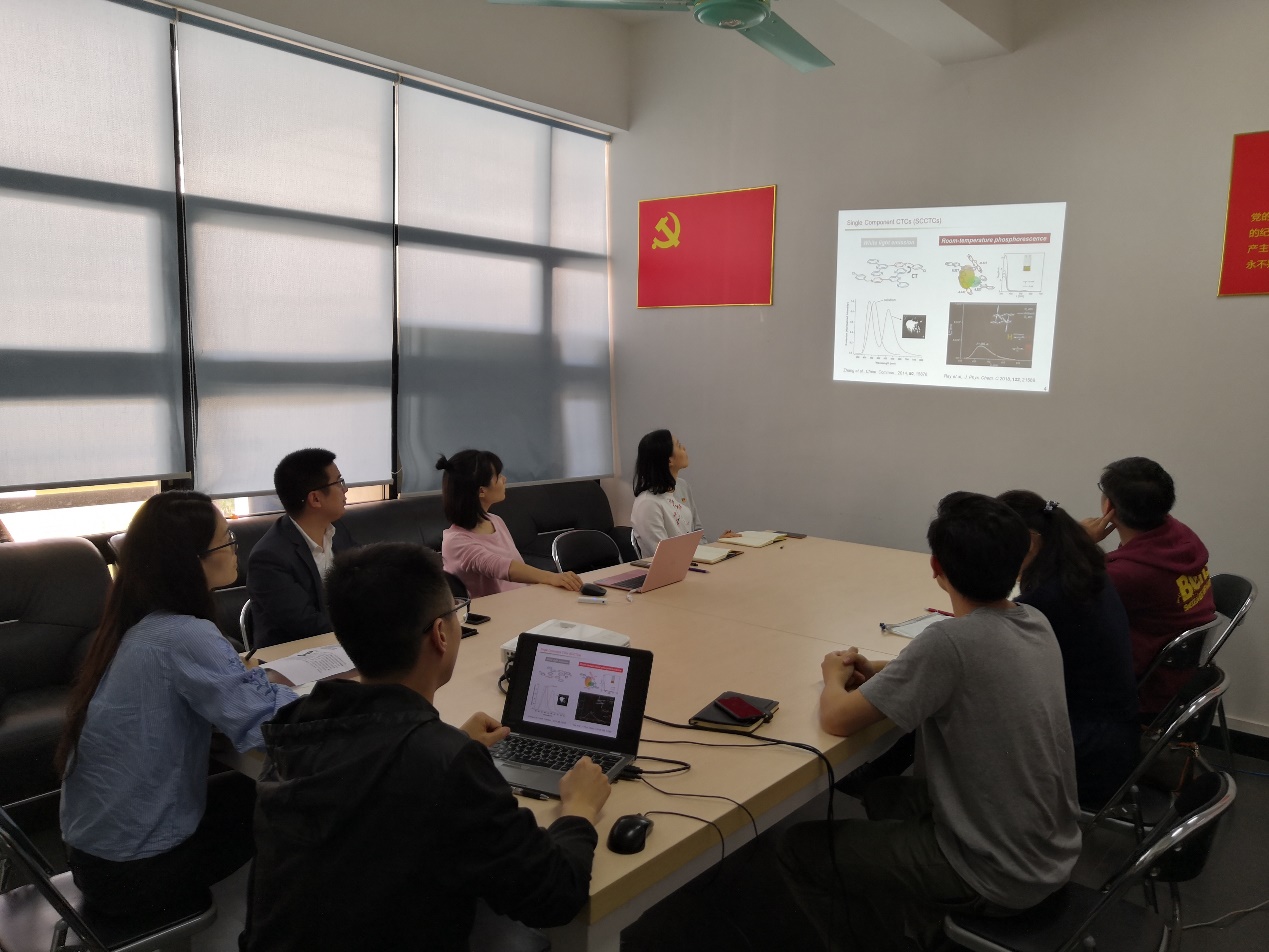 随后,陈文铖副教授主讲了以“单组份电荷转移复合物的光电应用”为题的学术报告,他主要讲解了近年来从事有机光功能材料的一些相关设计及应用,同时也向支部同志们展示了包括基于深蓝荧光材料与深红近红外热活化延迟荧光材料等领域的研究进展,在丰富了支部同志研究领域的同时,激烈的交流研讨氛围也加强了大家在该领域的了解与思维碰撞。