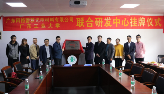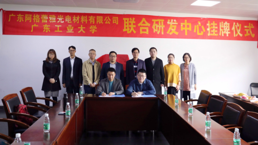 与广东阿格蕾雅光电材料有限公司联合研究中心揭牌仪式,标志着校企双方在产学研合作等方面正式建立合作关系,为双方在接下来的工作中进一步凝聚共识,探讨交流的领域与合作的方式,实现双方共赢迈出重要一步。