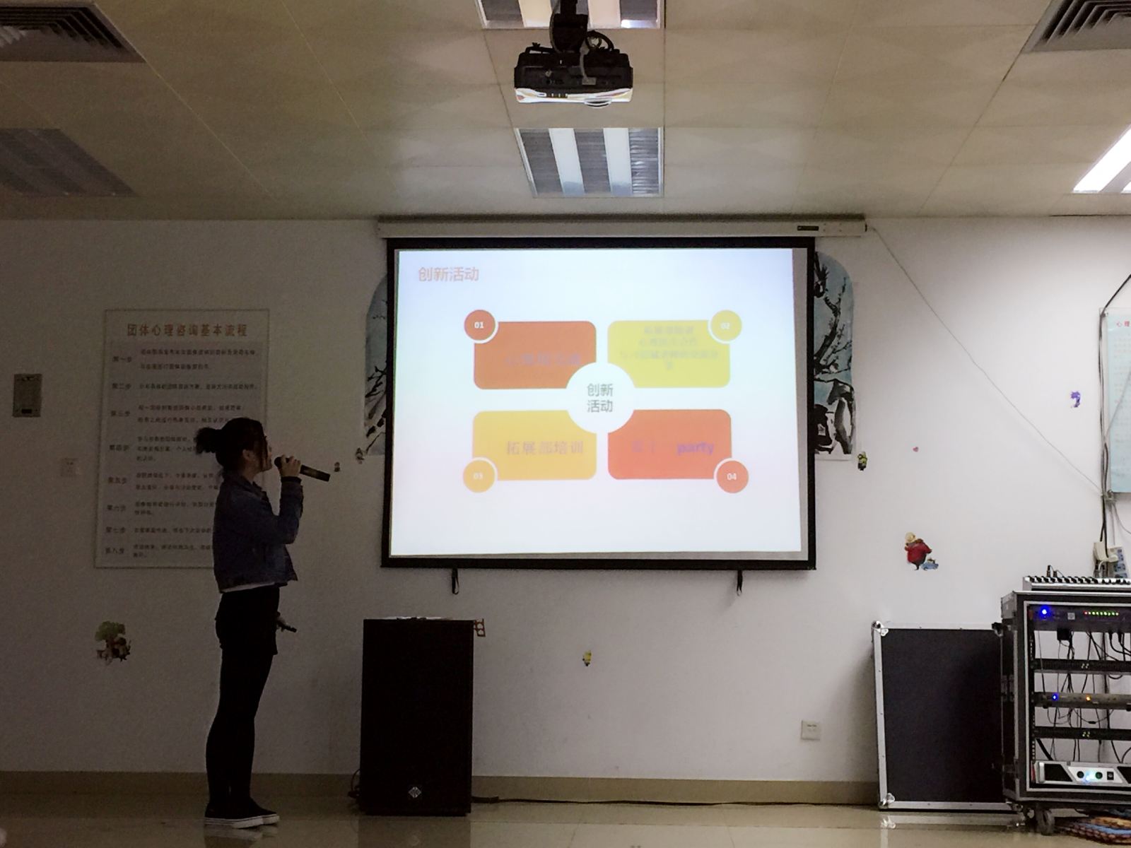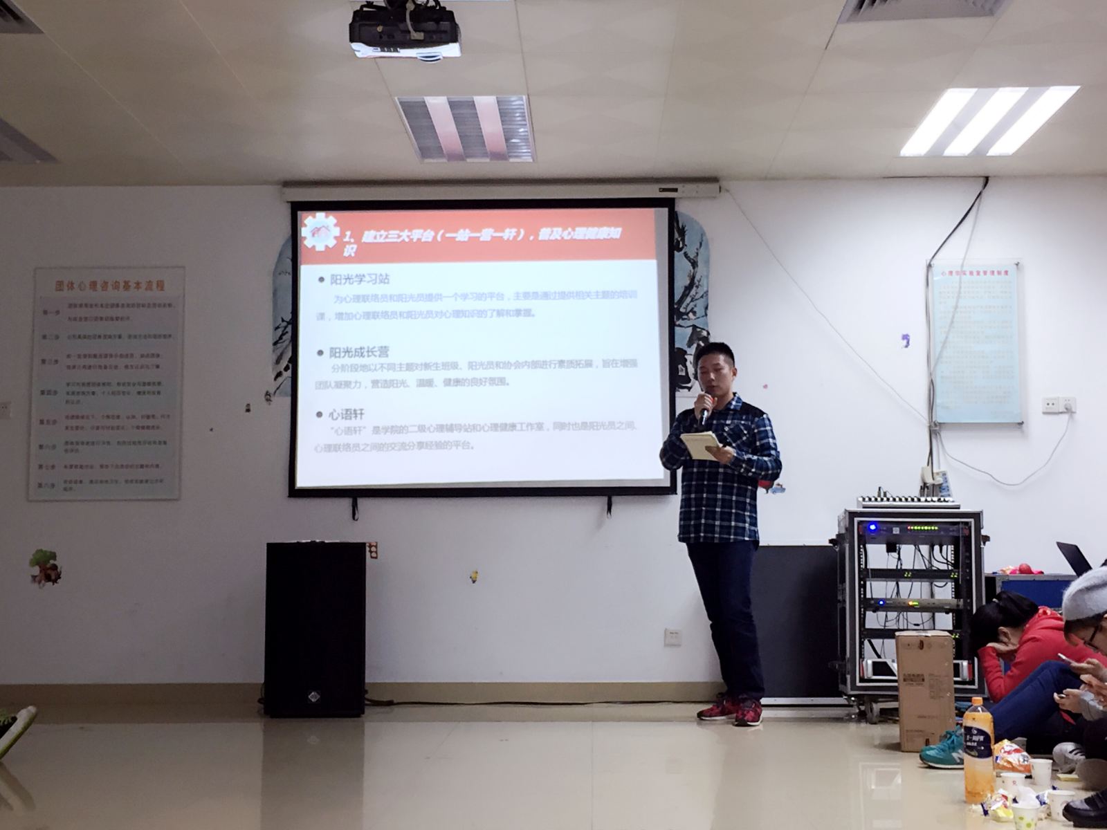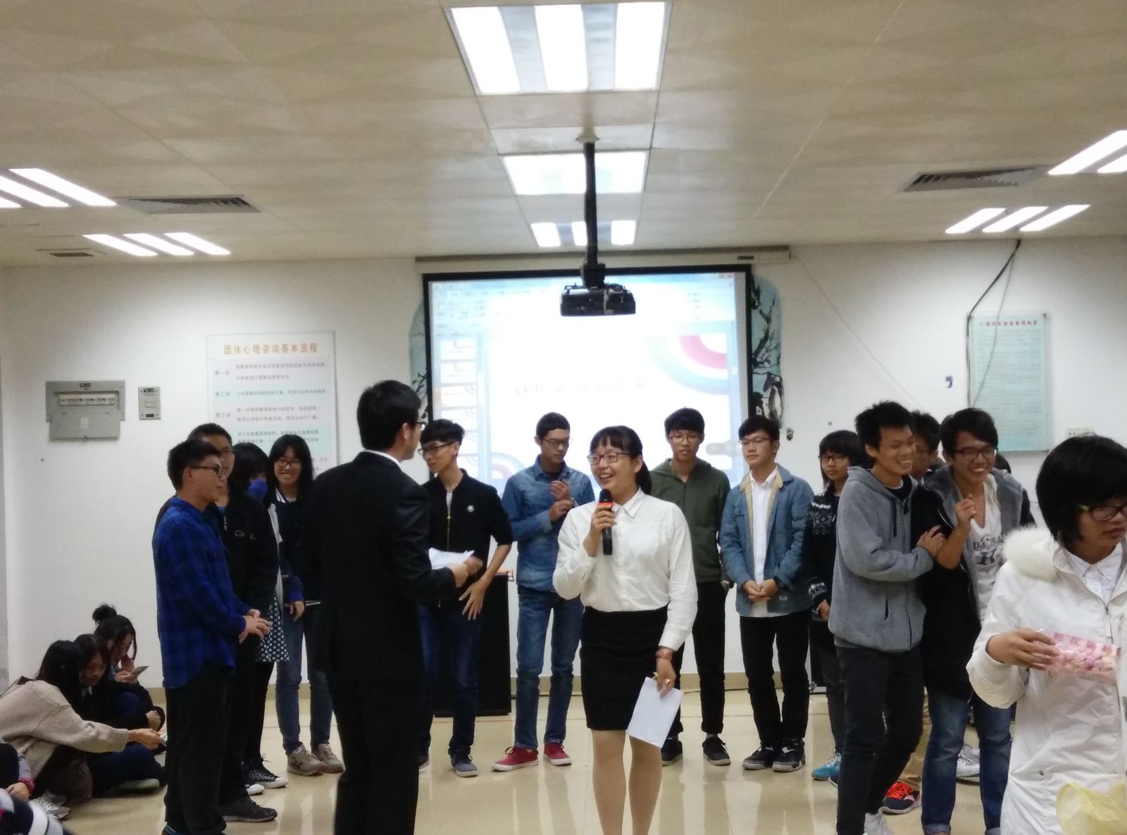 交流会分为两个环节,首先分别介绍学生心理健康工作的开展情况,经管学院心理服务中心以活动视频为开场,展现了他们专业而又多彩的活动,例如:模拟授课大赛、甘露行动、微电影大赛等。随后各部门做精品活动介绍,由素质拓展部到禁毒所开展的团体辅导——“甘露行动”令人印象深刻,部门成员讲述了一个个感人而又发人深省的故事,也让我们看到团体心理辅导的重要意义。接下来进入游戏环节,“天气预报”和“集体造反”等小游戏拉近了两个组织成员之间的距离,和谐气氛瞬间被带动起来。中场休息过后由阳光心协主席张韬发言,介绍疯AV 学生心理工作开展情况,大家纷纷对疯AV “一轩一营一站一刊”以及阳光员朋辈辅导队伍的建设点赞,但同时张韬也提出了阳光心协目前发展遇到的瓶颈,团体辅导、心理沙龙的专业化程度不够、班级心理联络员队伍建设不够完善,希望在此方面可以与经管学院心理服务中心有进一步交流合作机会。最后由经管心理服务中心王春香主任做总结发言,她对阳光心协的到访表示热烈欢迎,也对阳光心协开展的学生心理健康活动大为赞赏,希望两大组织今后互相合作、增进交流、共建友谊。