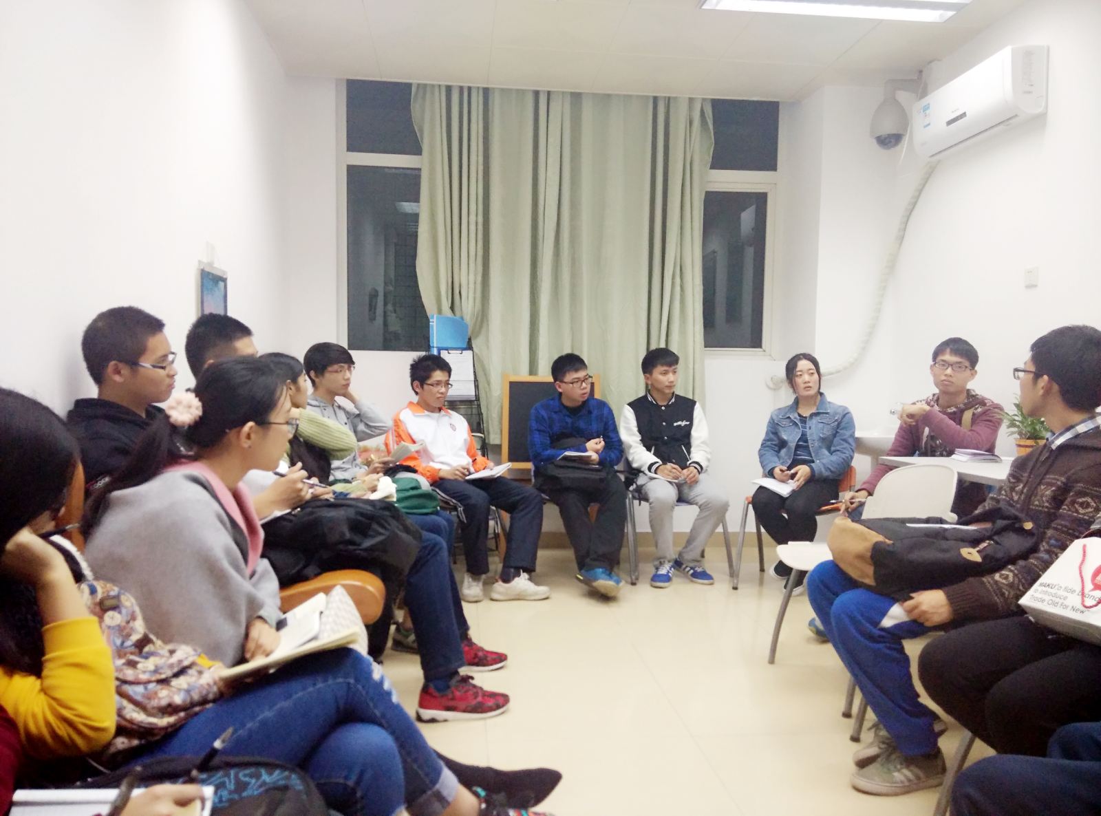 接下来进入 交流互动讨论环节,由广中医经管学院心理服务中心王春香主任主持。在交流讨论上,主要针对素质拓展、心理沙龙、学生社区心理健康的开展三个项目进行交流。经管心理服务中心拓展部部长讲述了素质拓展需要注意的四个方面:策划书的制定、音乐与现场氛围的融入、道具对活动的影响、拓展师的临场发挥能力;咨询部部长主要讲述了他们之前在广工成功举办的心理沙龙活动,介绍了有关举办沙龙的经验并给出了几点建议;张明老师结合实践经验为大家介绍了学生社区心理健康工作室的建设、注意事项及运作情况。最后张明老师希望两个组织加强合作,互助互利,热烈欢迎并邀请经管学院心理服务中心来疯AV 交流指导。