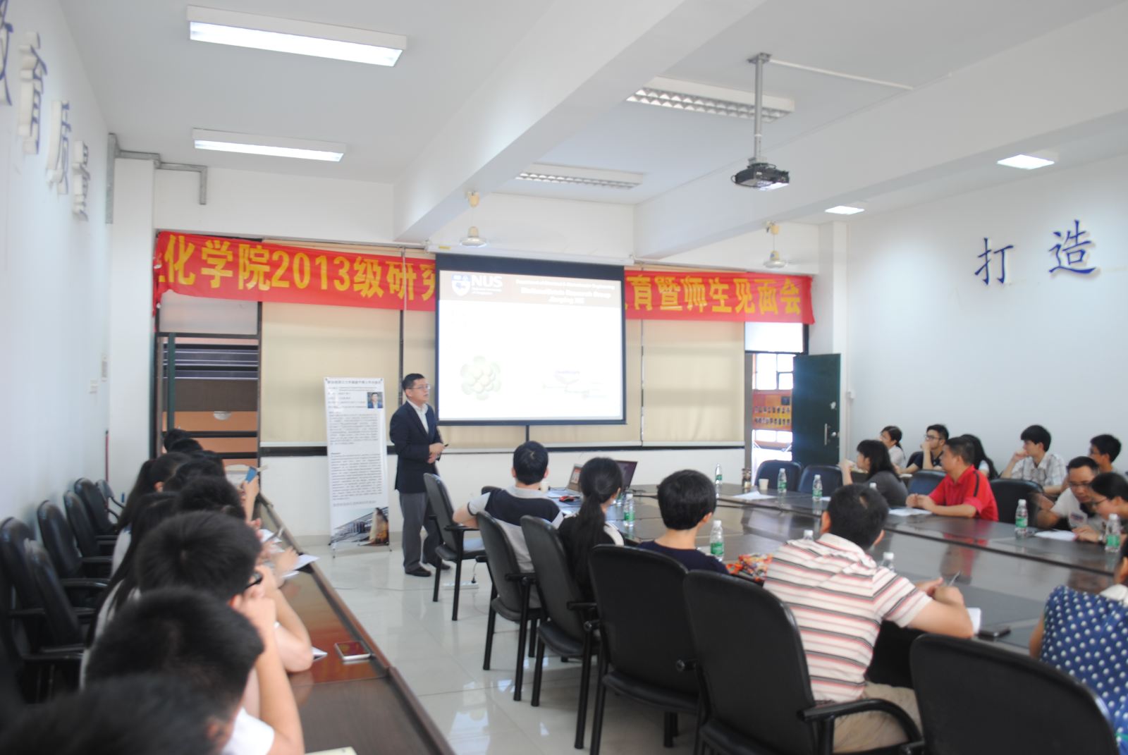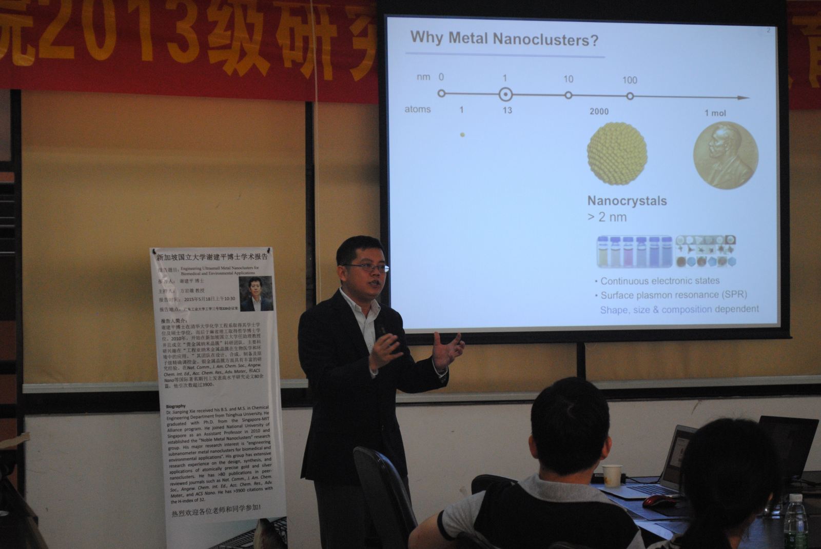 博学讲坛表示热烈欢迎。谢建平博士为在座师生作了题为《Engineering Ultrasmall Metal Nanoclusters for Biomedical and Environmental Applications》的学术报告。通过展现不同分子量金元素金属纳米晶簇的设计、合成及其性能的优越性,他进一步简述了这些超小型金属晶簇在生物医学和环境中的应用。尤其令人印象深刻的是,该类明确定义的物质具有低毒和高荧光性,可望作为荧光探针应用于癌症的治疗。谢建平博士还为在座的师生介绍了新加坡国立大学的概况,化工行业在新加坡的经济地位以及发展前景,并希望同学们可以到新加坡国立大学进行学习访问。提问环节中,由于谢建平博士展示成果的新颖性, 在座师生颇感兴趣,都纷纷提出疑问,并结合自身科研课题进行交流互动。