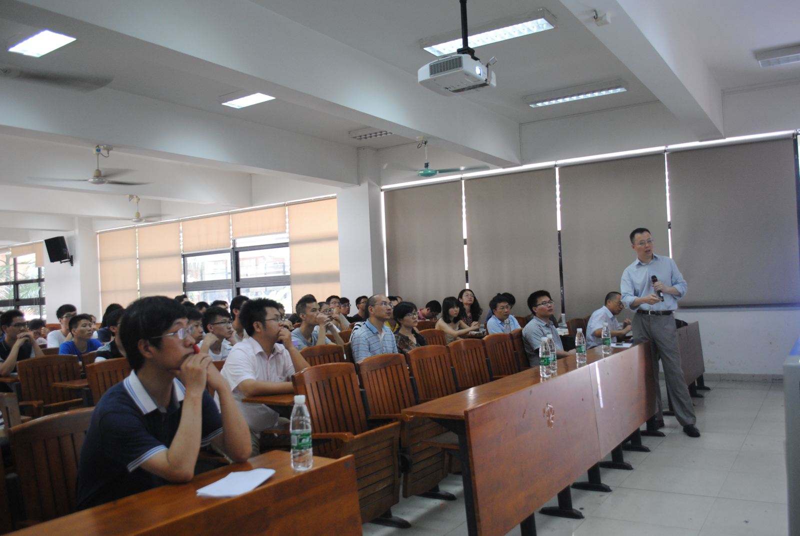 作为多孔骨架硫化学的创始人,徐教授为在座师生作了题为《多孔骨架硫化学的发端和现状》的学术报告。从含硫有机配体分子设计最初的想法到日渐成熟的金属有机框架(MOF)的构建,徐教授为我们分享了他一整套科研思路的发展历程,并介绍了该类化合物在传感、分离、催化和光电的应用领域的探索和成果。以时间为线索,徐教授展示了其团队先后合成的各种有趣的MOF材料,有的材料在光照条件下展现了光致变色效应,有的材料在吸收各种金属离子后显现不同的颜色而由有应用于化学传感器的潜力,有的材料还可应用于放射性物质的检测等等。尽管硕果累累,但徐教授仍以谦虚的态度对待着科学这棵参天大树,指出这些新型材料未必与苛刻的工业条件相兼容,探索与改进之路仍需坚定不移地走下去。提问环节中,由于徐教授边展示成果边阐述设计理念的报告风格对在座师生极具启发性,师生纷纷提出疑问并与徐教授探讨自己的想法,你来我往的互动使现场的学术气氛愈加浓厚。