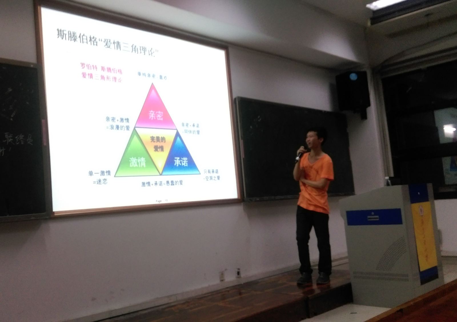 此次培训以“爱情是什么”为主题。首先阮老师播放了一个关于“小朋友心目中的爱情”的视频短片,接着重点为大家介绍了“爱情三角理论”“依恋理论”以及恋爱时大脑的运作等知识,最后通过一个小测试让大家初步判断自己属于哪一类型的恋人,从而可以更好的完善自身,帮助同学了解自我。