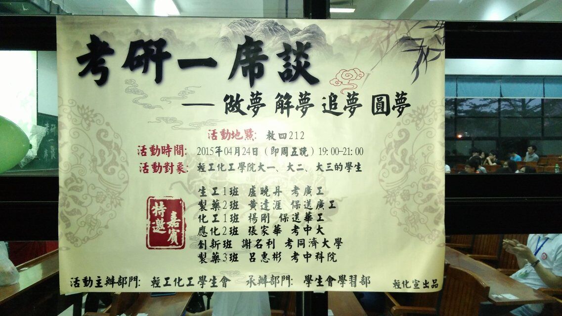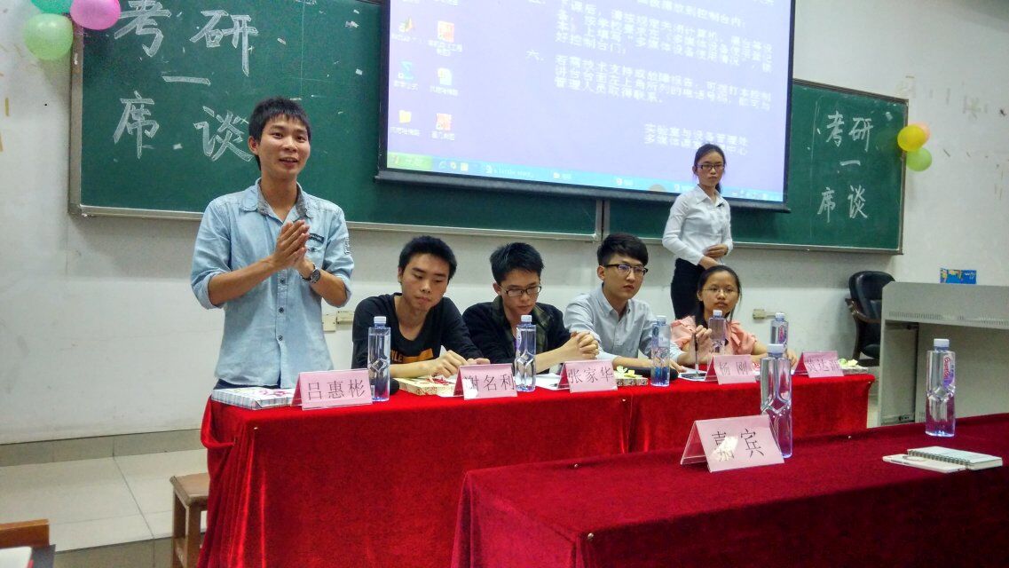 为了帮助疯AV 有意愿考研或考研准备中的同学们更加系统地了解考研,疯AV 学生会在保持了往届特色的基础上创新性地开展了一场思想交流盛宴——考研一席谈。本次活动于4月24日晚上7点开始在教4-212隆重举行,持续了2个多小时。出席本次活动的嘉宾有学生会指导老师兼14级辅导员毛元渊老师、疯AV 学生会副主席李启钊、保研到广工的黄达涯、保研到华工的杨刚、考上中山大学的张家华、考上同济大学的谢名利、考上中国科学院大学的吕惠彬及各部门部长等。