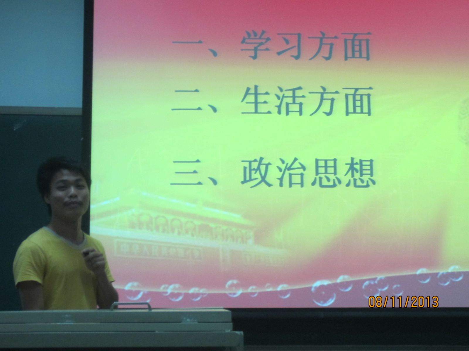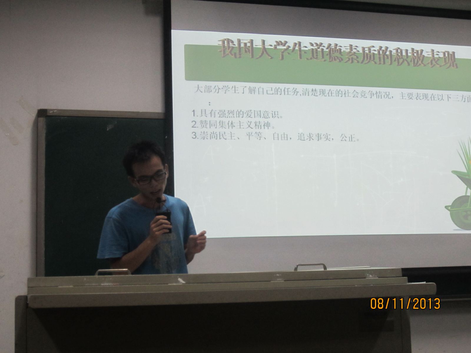 李旺和徐国洋同学分别以“当代大学生的现状”为主题讲述了自己的观点和认识,并与大家进行了互动交流。李旺同学结合自己的观察,阐述了我国大学生思想道德方面的现状,他认为目前我国大学生道德素质比较好,思想政治水平较高,但在一定程度上丧失了吃苦耐劳和勤俭节约的精神,理想追求淡化,生活行为失范,比如:饭菜浪费现象比较普遍,随地吐痰、乱扔垃圾等不文明行为时有发生。他与大家共同分析了具体原因,从个人成长成才的角度提出了提升道德水平的建议。徐国洋同学则从学习和生活两方面阐述当代大学生的现状,指出当代大学生普遍对学习关注度降低,逃课现象突出,对生活没有明确的目标,随波逐流,对金钱和利益过度崇拜,他告诫同学们要珍惜现在的大学时光,摒弃陋习,养成良好的生活作风。